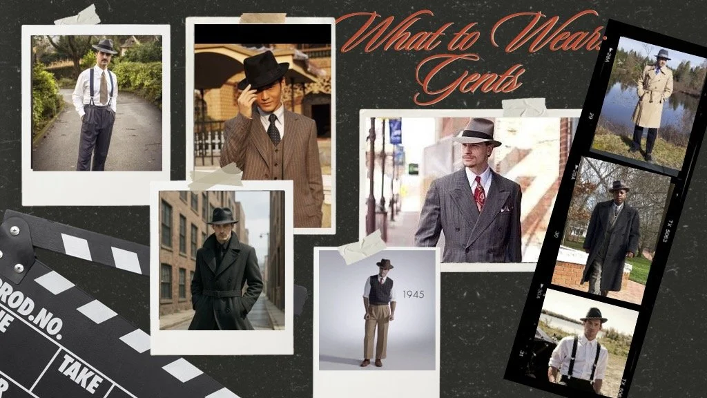 Ladies: Channel vintage 1940s starlets in slinky gowns or dark, dramatic silhouettes. Elegant modern evening wear also works if you’d rather add your own twist.